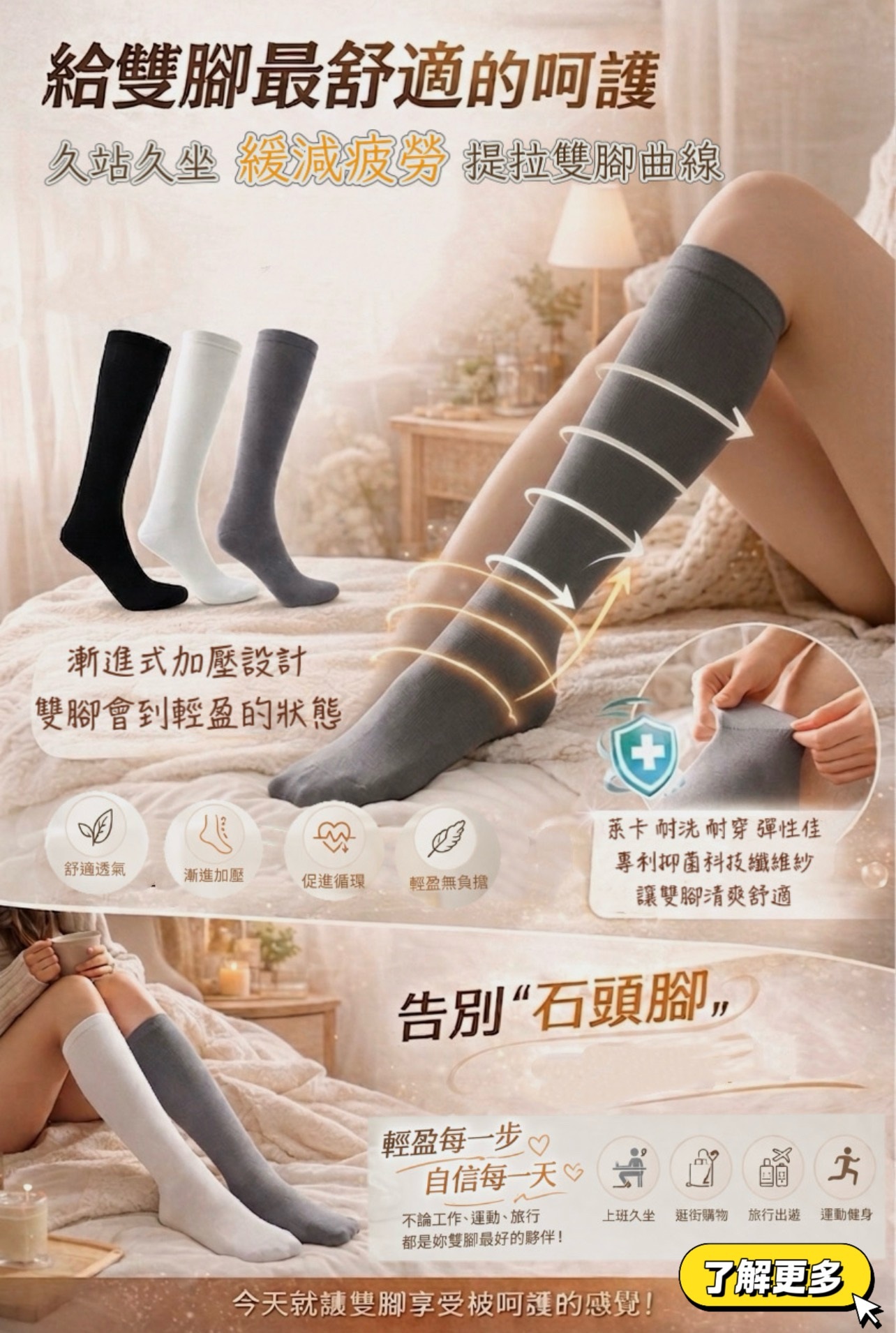 促進血液循環:透過精準加壓,像幫浦一樣協助血液順暢回流,預防下肢浮腫與靜脈曲張。